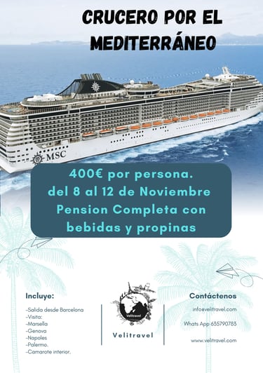 CRUCERO POR EL MEDITERRANEO Del 8 al 12 de Noviembre, Pension Completa, con propinas y bebidas incluidas. 400€ por persona.