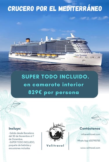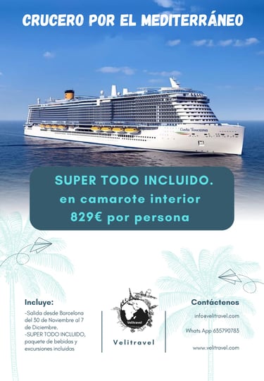 CRUCERO POR EL MEDITERRANEO Del 30 de Noviembre al 7 de Diciembre, Camarote Interior en SUPER TODO INCLUIDO. 829€ por persona
