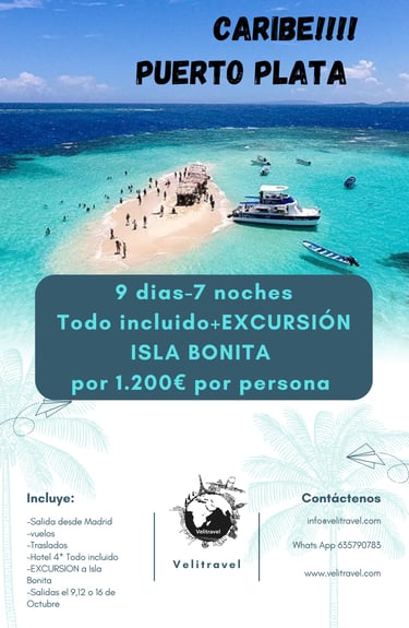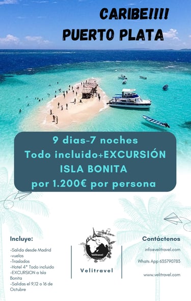 9 dias -7 noches Puerto Plata, Todo INcluido, Vuelos+Traslados+Alojamiento hotel 4* todo incluido* EXCURSION a ISLA BONITA. Salidas 9, 12 o 16 de Octubre, 1.200€ por persona.