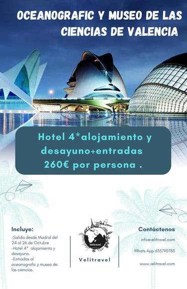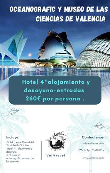 Valencia: Hotel 4*Alojamiento y desayuno+Entradas Oceanografic y museo de las Ciencias. 260€ por persona.